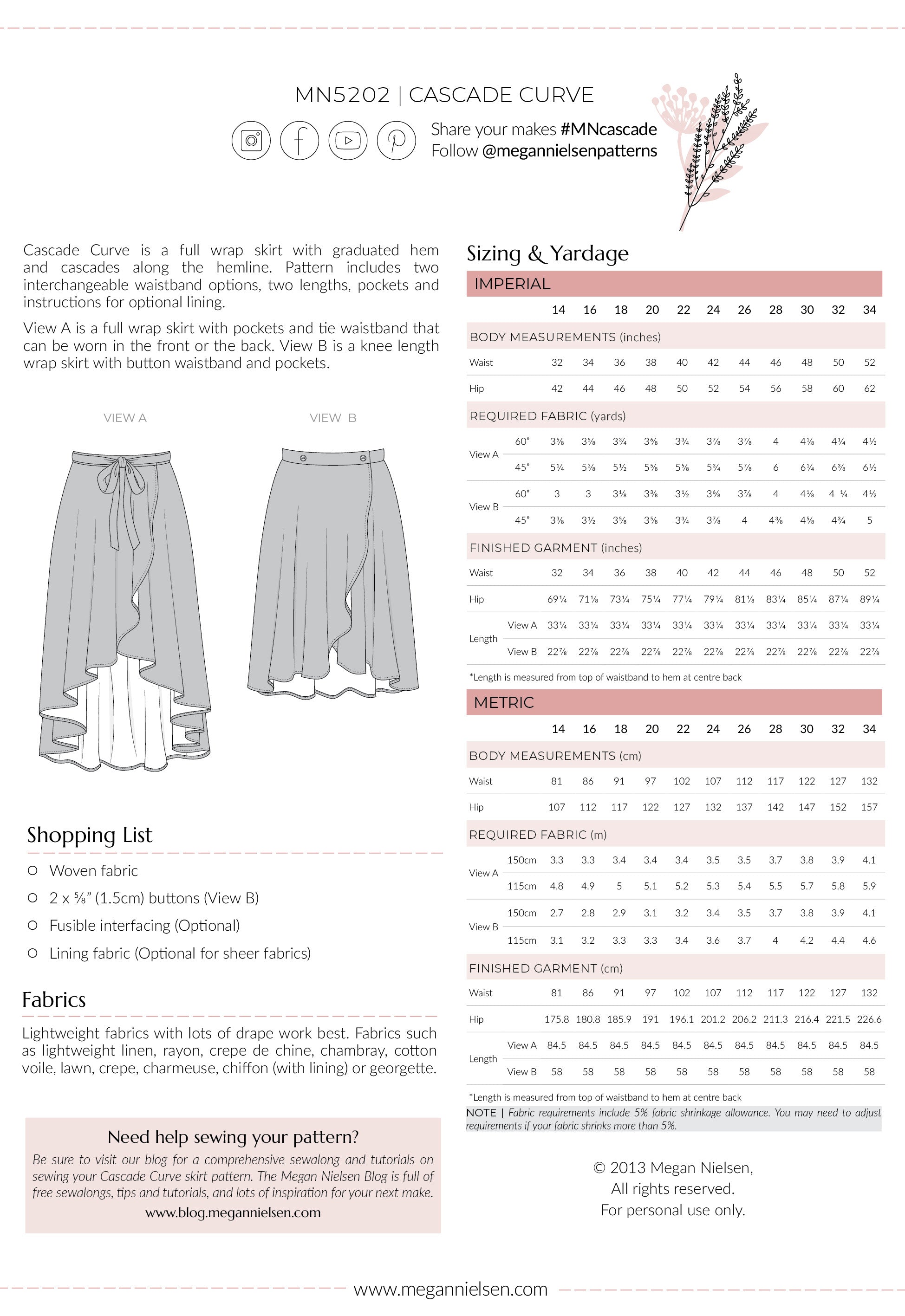 Cascade Curve is a full wrap skirt with graduated hem and cascades along the hemline. Pattern includes two interchangeable waistband options, two lengths, pockets and instructions for optional lining.
